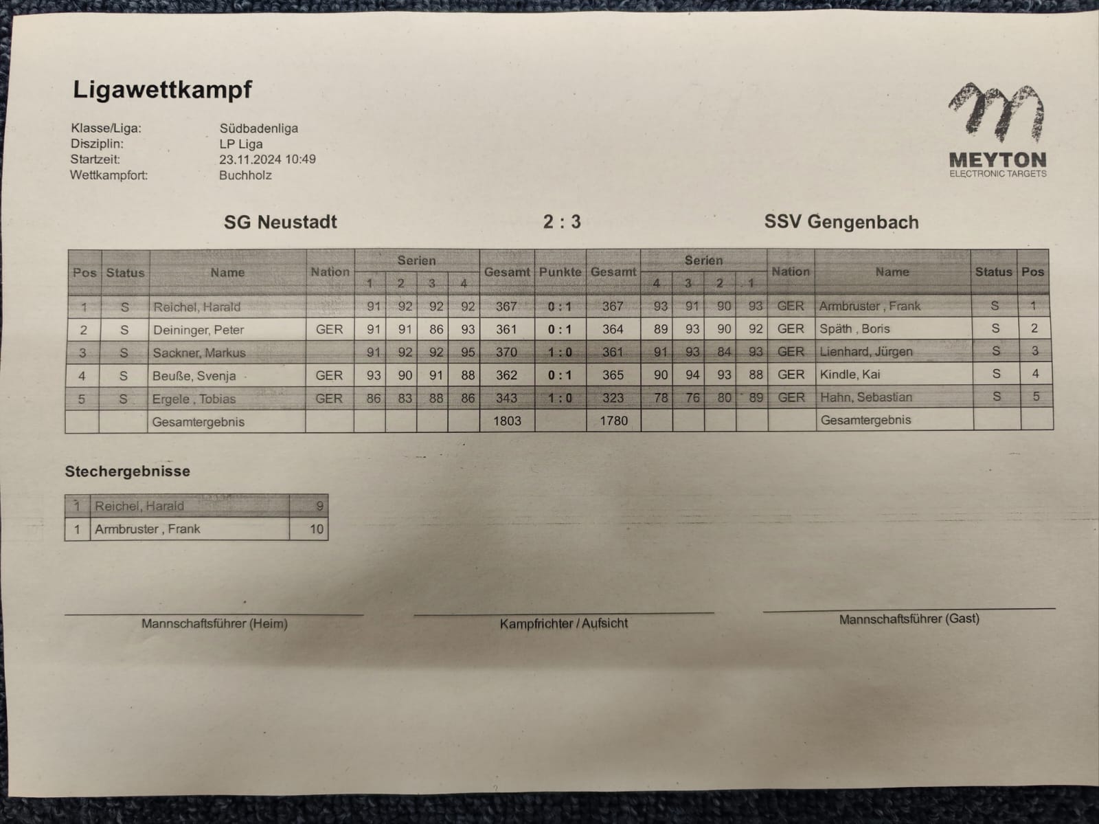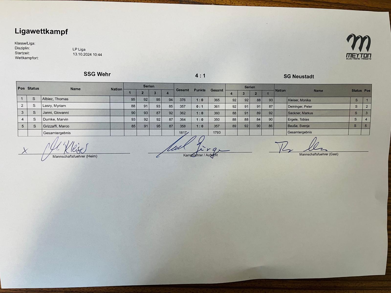 Am 1. Doppelwettkampftag musste unsere Mannschaft SG Neustadt LP1 zuerst gegen die SSG Wehr LP1 antreten und hat ihren Wettkampf mit 1:4 verloren. Den 2. Wettkampf konnte dann unsere Mannschaft SG Neustadt LP1 mit 3:2 gegen den SSV Welschingen LP1 gewinnen.