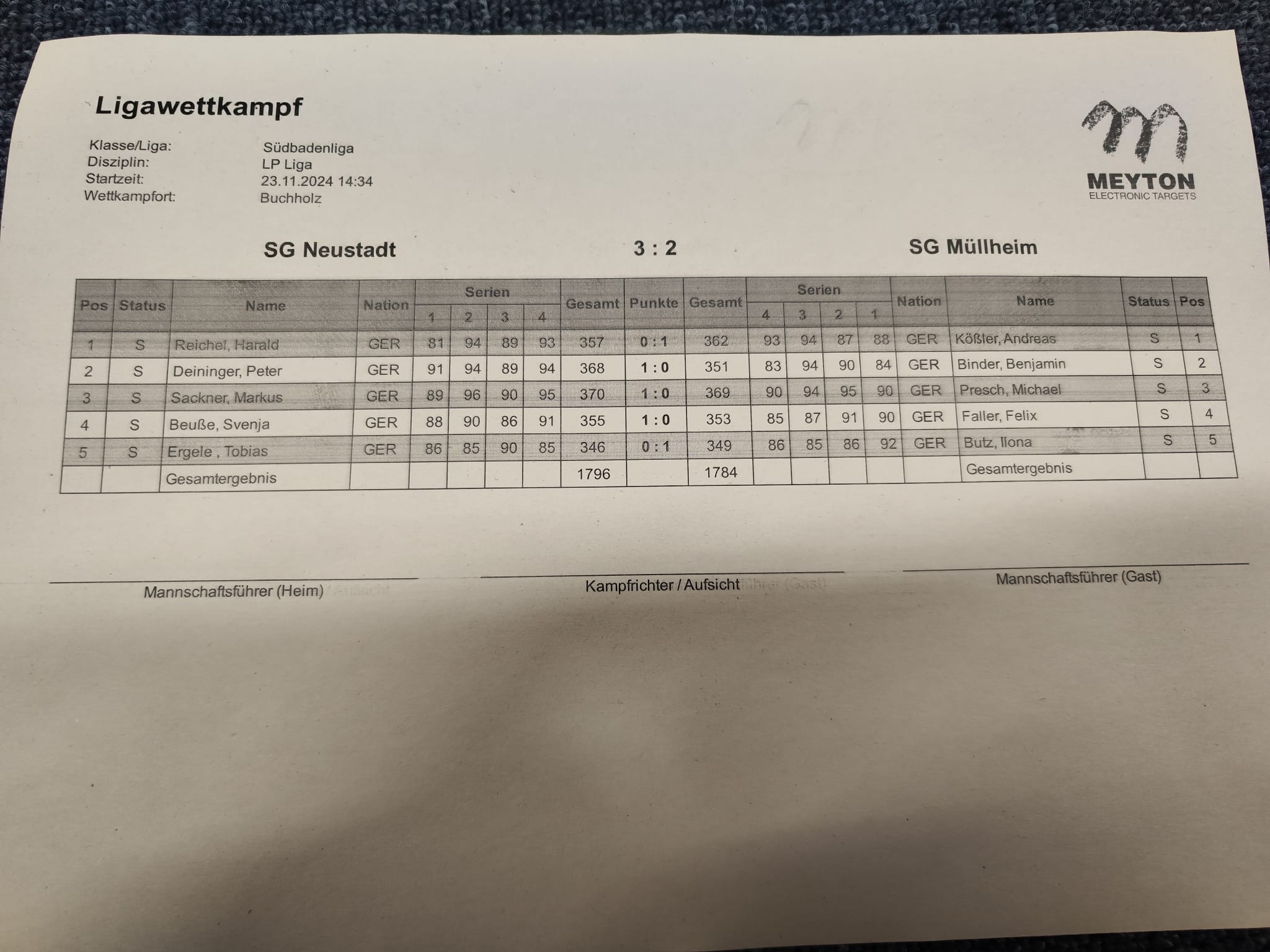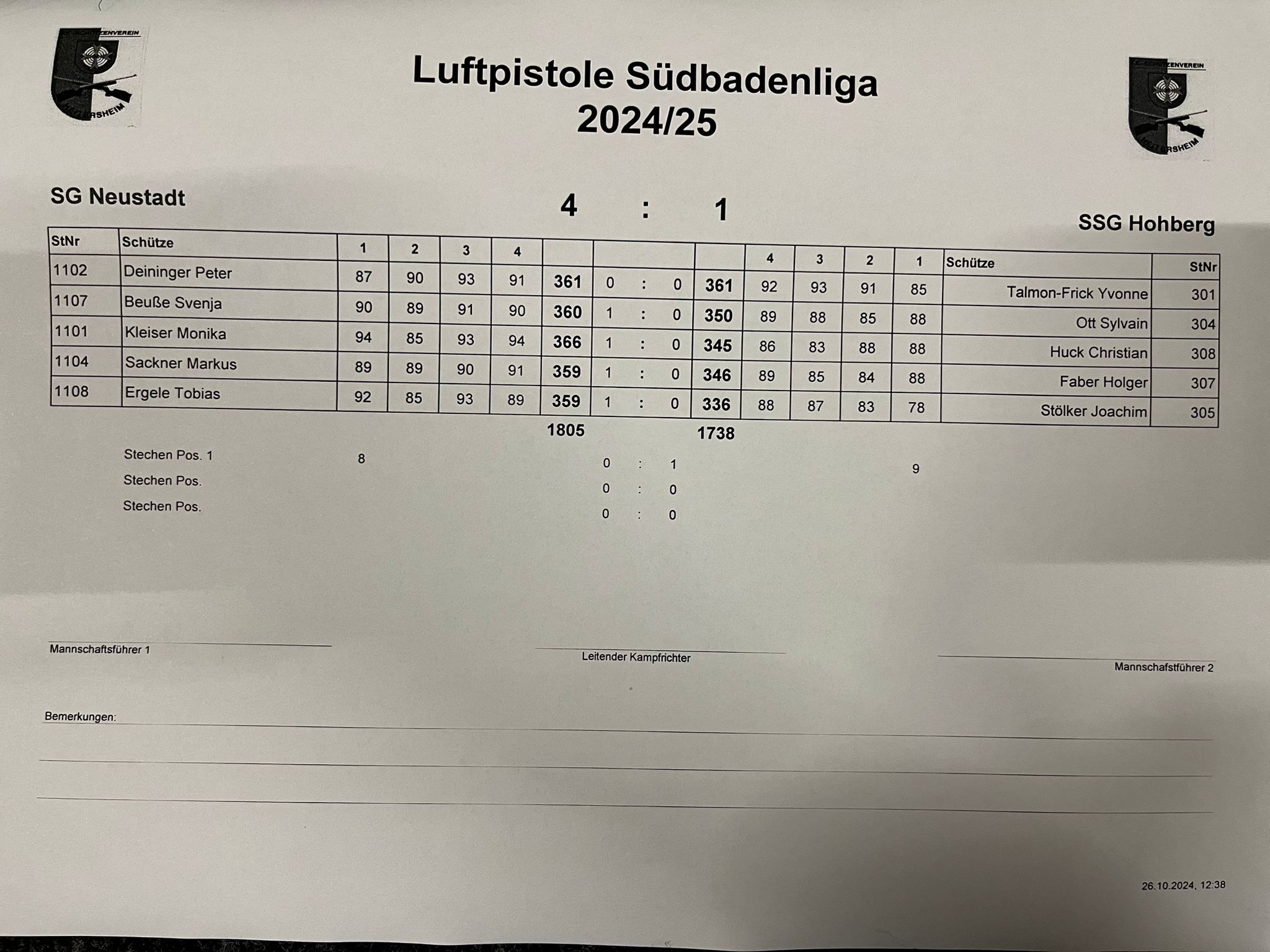 unsere Luftpistolenmannschaft SG Neustadt Luftpistole 1 startete in ihre 3. Saison in der SüdbadenLiga. Am 13. Oktober 2024 ging es mit dem 1. Doppelwettkampf los. Diese Saison sind die Schützen/innen  Peter Deininger, Monika Kleiser, Markus Sackner, Tobias Ergele und Svenja Beuße vertreten. Alle sind hochmotiviert und freuen sich auf spannende Wettkämpfe.