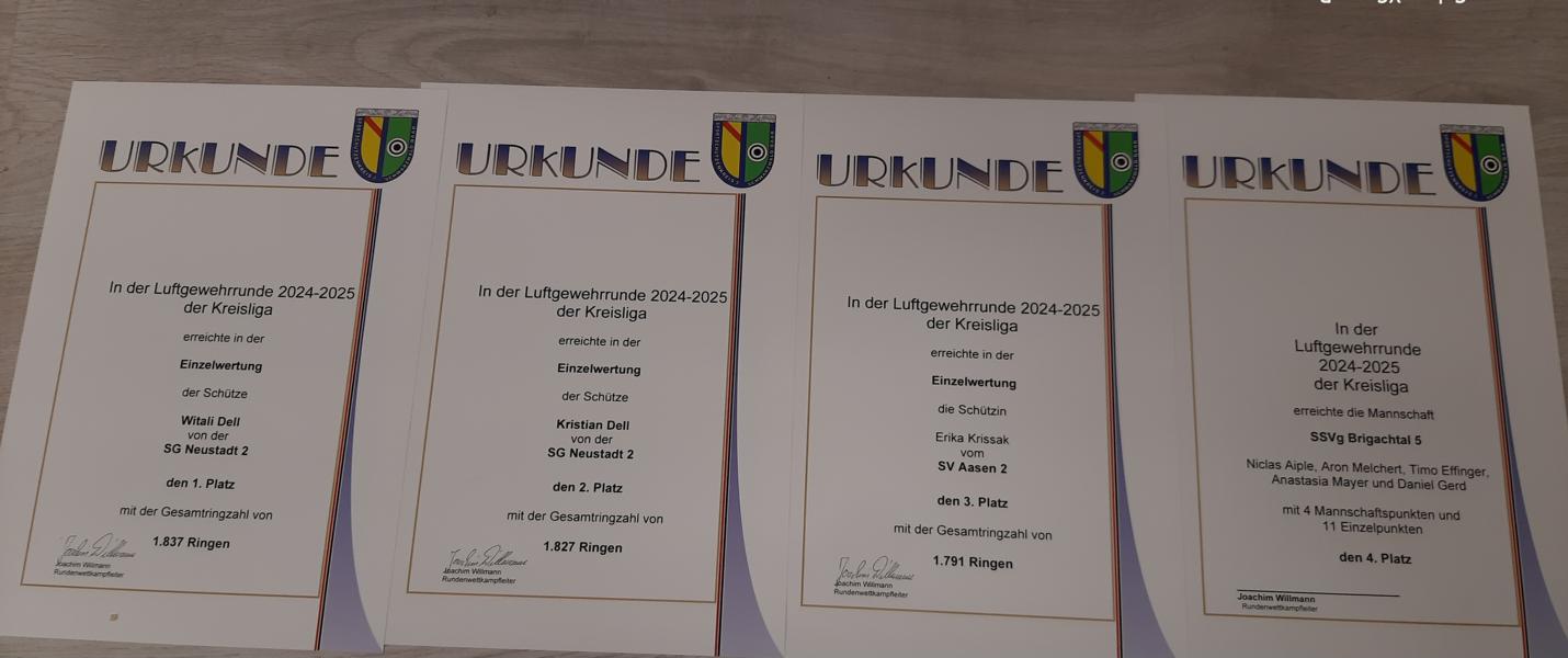 Sieger der KreisLiga Luftgewehr 20245/2025 ist unsere Mannschaft SG Neustadt LG2 !! Unsere Mannschaft gewann alle 5 Wettkämpfe und hat somit 10 Mannschaftspunkte und 19 Einzelpunkte auf seinem Konto. Der SSV Tennenbronn LG6 konnte sich mit 8 Mannschaftspunkte und 16 Einzelpunkte den 2. Platz erschießen, Dritter ist der SV Aasen LG2 mit 6 Mannschaftspunkten und 14 Einzelpunkten.