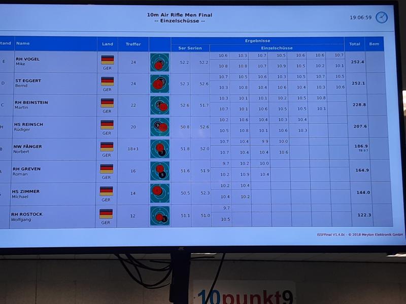 Peter Jordan konnten in der KLasse Senioren 2 mit 315,3 Zehntelringen einen supertollen 17. Rang unter insgesamt 195 Teilnehmern in dieser Klasse erzielen. Für Nikolaus Willmann sprang mit 312,7 Zehntelringen der gute Platz 83 unter 223 Teilnehmern heraus. 308,2 Zehntelringe und Rang 143 schaffte unser Gerhard Rombach.