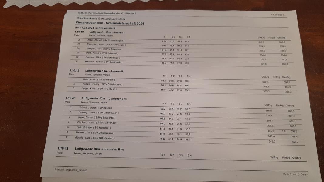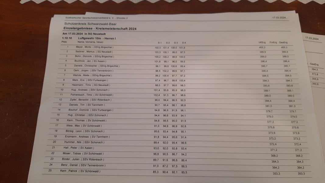 Die Schützen/innen trafen sich am Samstag, den 23.03.2024 im Schützenhaus der SG Hüfingen zu ihren Wettkämpfen mit der Luftpistole. Bei den Herren I konnte Markus Sackner (SG Neustadt) mit 355 Ringen sich den Kreismeisertitel sichern. Gleich auf dem Silberplatz folgt ihm Peter Deininger (SG Neustadt)  mit 354 Ringen. Peter und Markus haben gegenüber dem letzten Jahr die Plätze getauscht. Den Dritten Platz holte sich Robin Merz  (SV Tannheim ) mit 348 Ringen, Tobias Ergele ( SG Neustadt) landete mit 345 Ringen auf dem 4. Platz, Bastian Willmann (SG Neustadt) wurde mit 308 Ringen 10.ter.