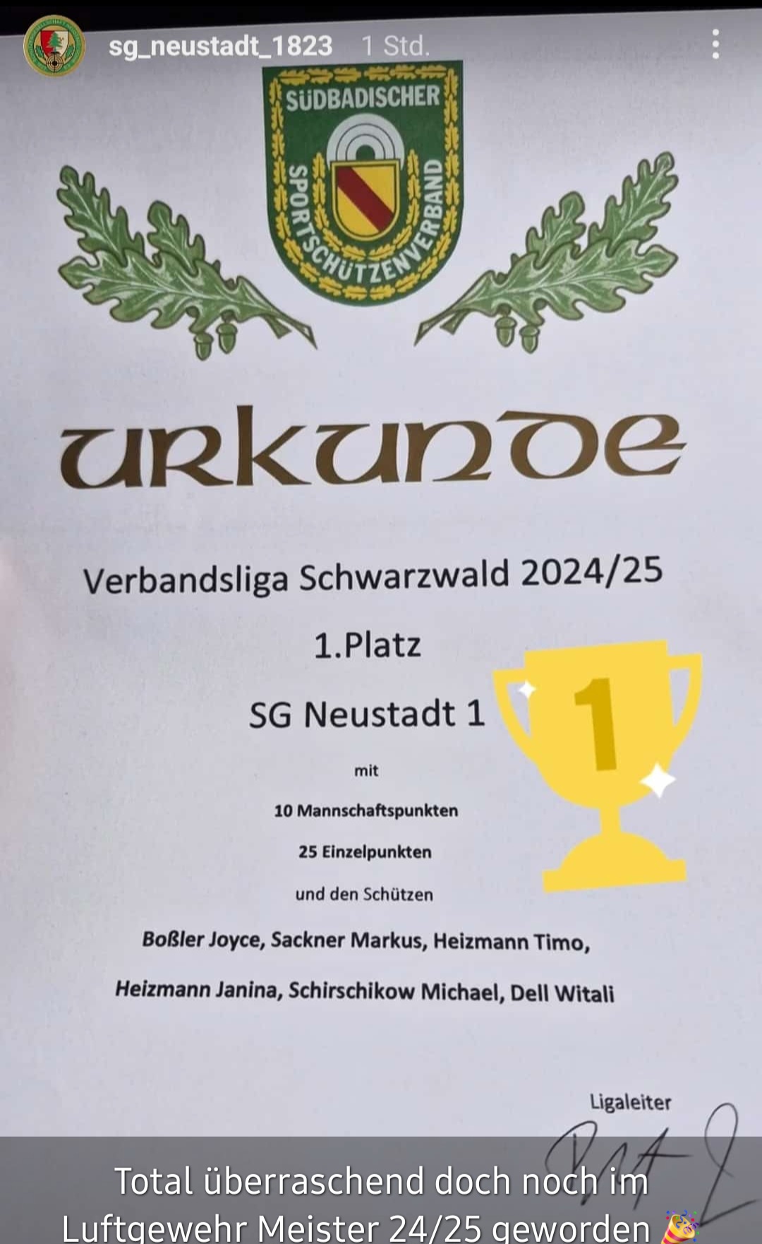 Was für eine tolle Leistung unserer Schützen und Schützinnen aber auch unsere SG Neustadt!! Wir gratulieren Joyce, Janina, Markus, Timo, Michael und Witali ganz herzlich zu diesem Riesenerfolg.