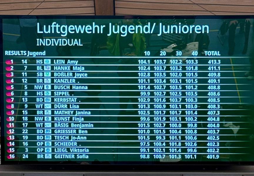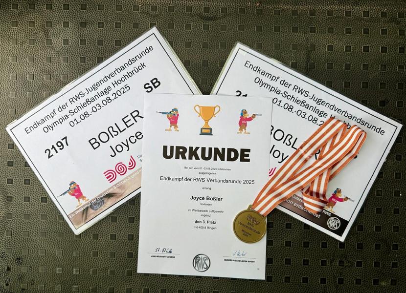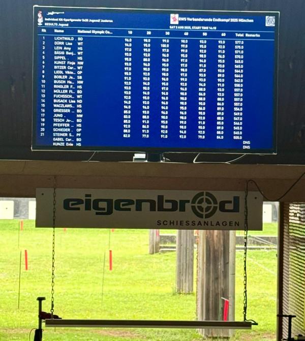 logo sbvVom 01. bis 03. August fand in München das Finale der Jugendverbandsrunde 2025 statt. Die besten Nachwuchsschützen aus den Landesverbänden Württemberg, Baden, Bayern, Brandenburg, Hessen, Pfalz, Nordwestdeutschland,  Oberpfalz, und Südbaden waren dort vertreten und gaben sich einen Wettkampf auf Top-Niveau. Diese Veranstaltung ist für die jungen Schützen nach den Deutschen-Meisterschaften der zweitwichtigste Wettbewerb in der Saison und somit quasi die Generalprobe für die in wenigen Wochen beginnende DM 2025, die ebenfalls wieder in München stattfinden wird. Wir freuen uns und sind stolz, dass aus unserem Verein wieder Joyce Boßler, Angelina Dell und auch Larissa Gräßlin mit ihren Kader-KameradInnen mit dabei waren. Begleitet wurden sie von einem tollen Trainer-Team, das mit Peter Büche, ebenfalls aus unserem Verein, den bestmöglichen Support für die SBSV-Athleten sicherstellte.