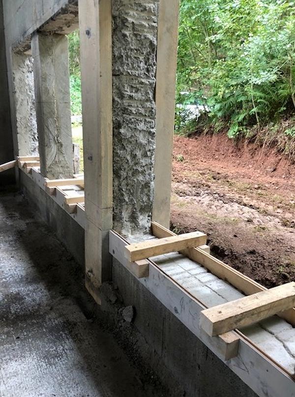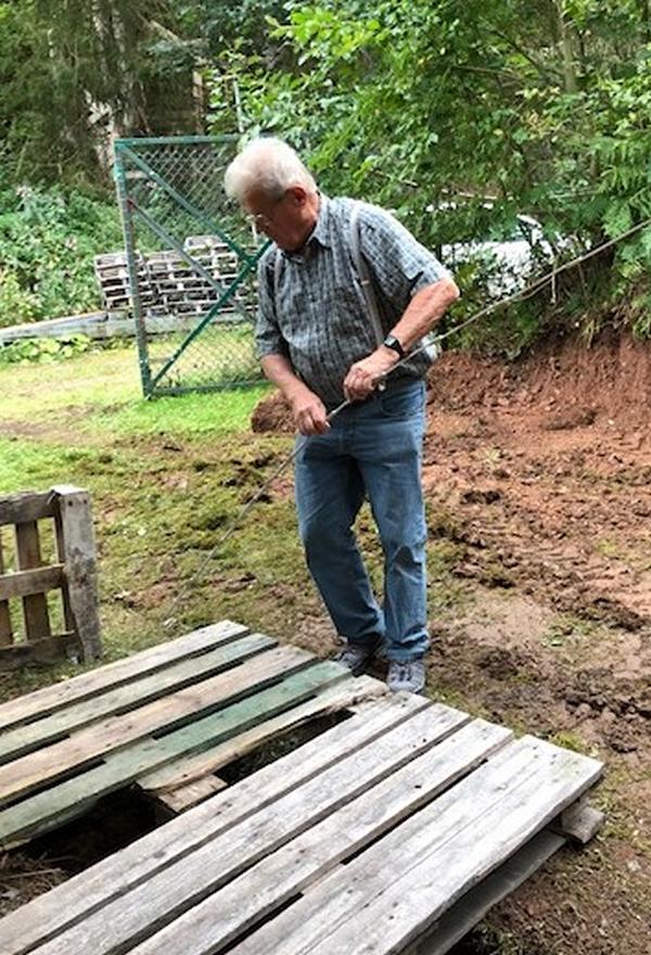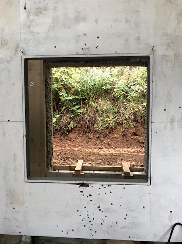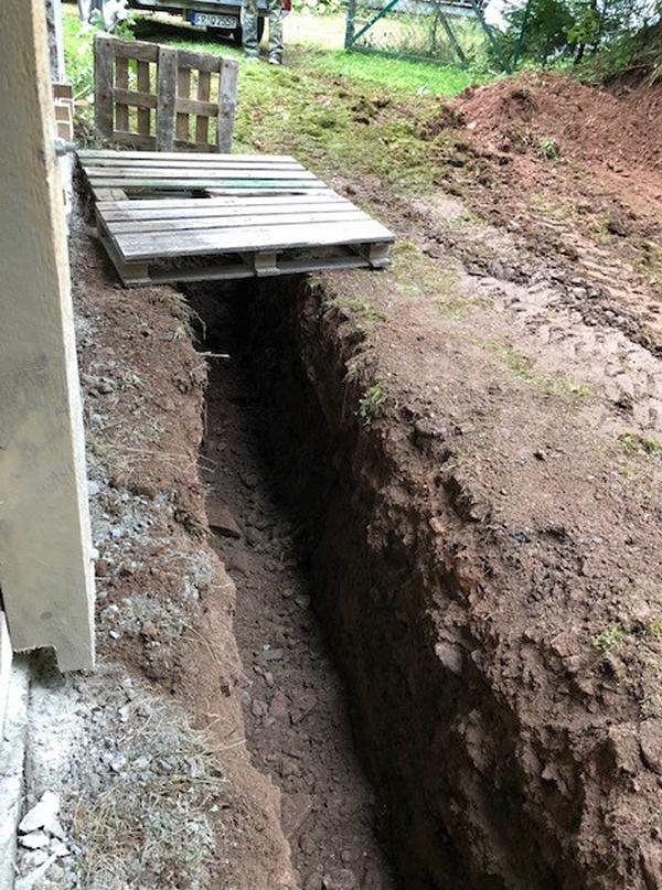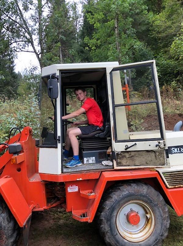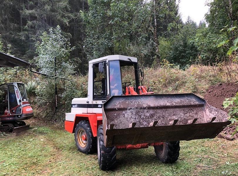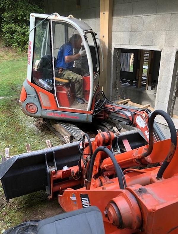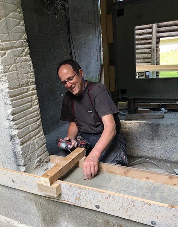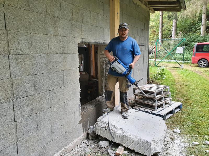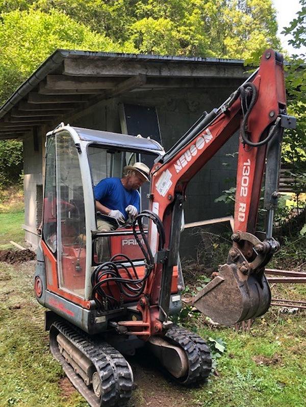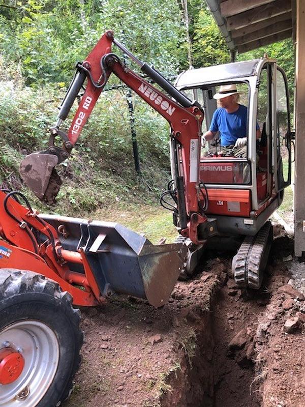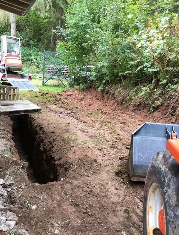 Nikolaus, Harald, Peter mit Unterstützung von Timo richteten am Samstag die Löcher für die Fundamente und die Schalung für die Auflager. Dank Bagger und Radlader war für den Aushub der Fundamente mehr Fingerspitzengefühl als Muskelkraft gefragt. Für die Wandöffnungen hingegen musste aber der Hilti dann doch auch nochmals gebändigt werden.