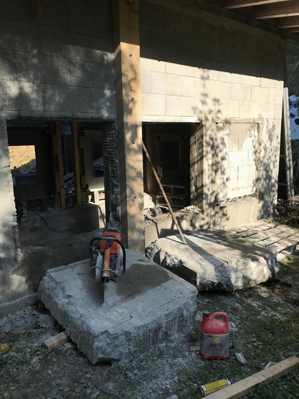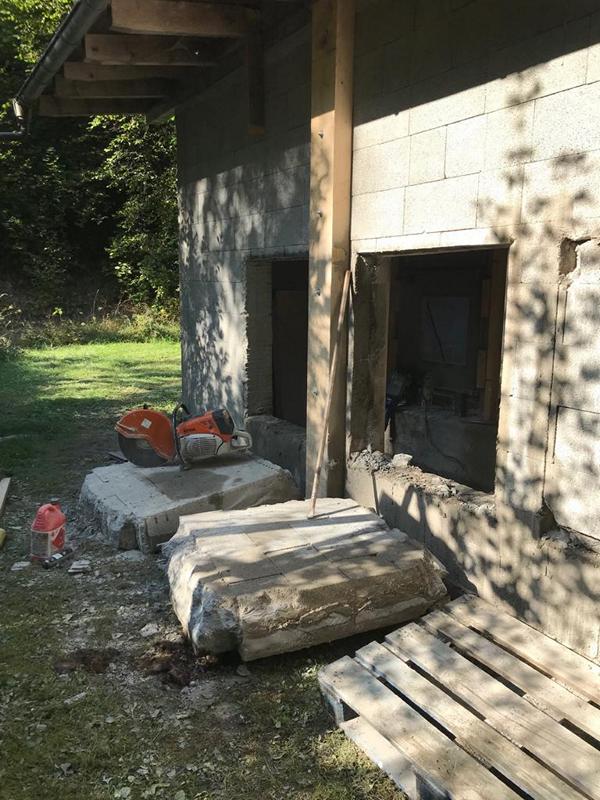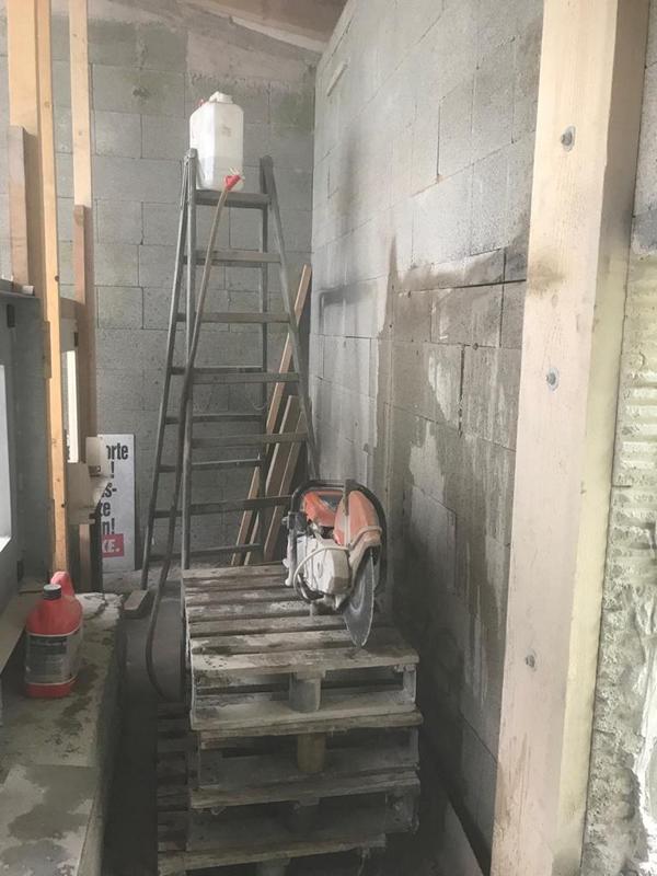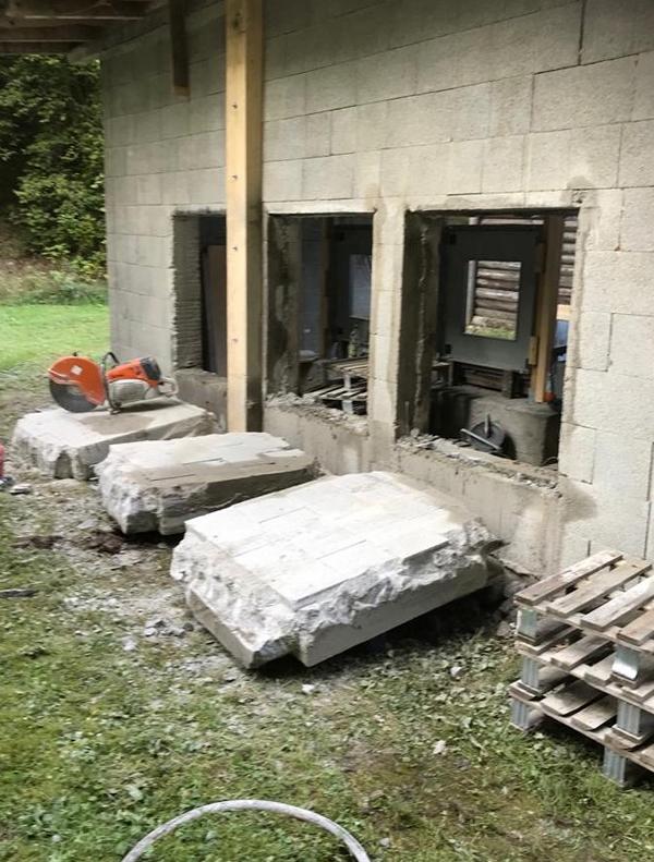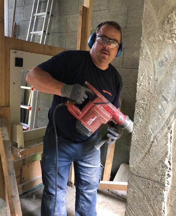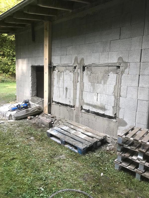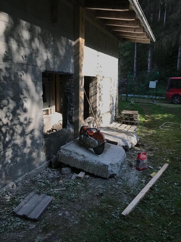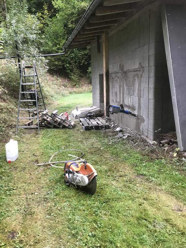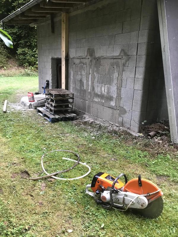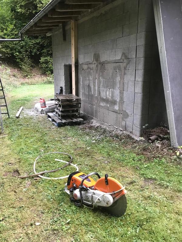 Am 18.09 hat Arthur sich der 3 Löcher in der Wand angenommen. Wir wollten die Löcher ja rausbohren aber nachdem wir mit dem 1. Loch angefangen hatten, und Peter Büche schon 5 Stunden mit seinem Hilti Bohrer fleisig am bohren war, mussten wir einsehen dass es so nicht weitergehen konnte!! Arthur hat uns dann erzählt, dass er vom Geschät die Beton Motorsäge bekommen könnte und schon hatte er die Arbeit am Hals!!