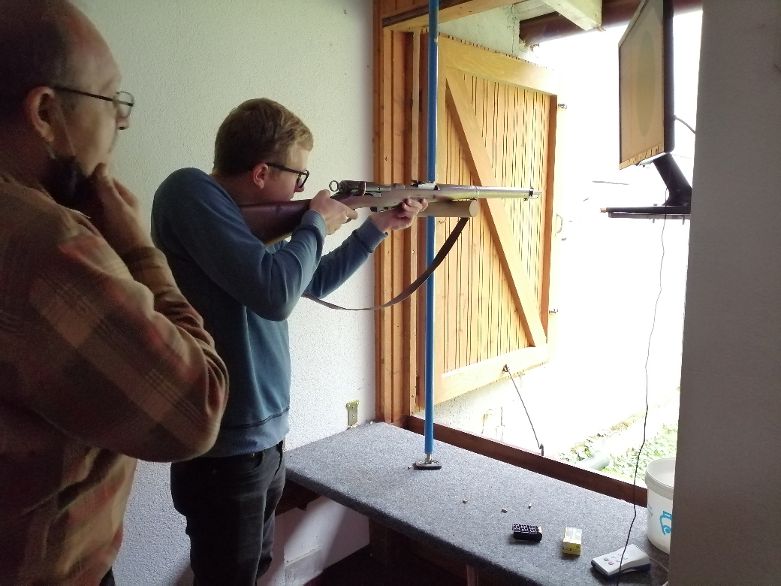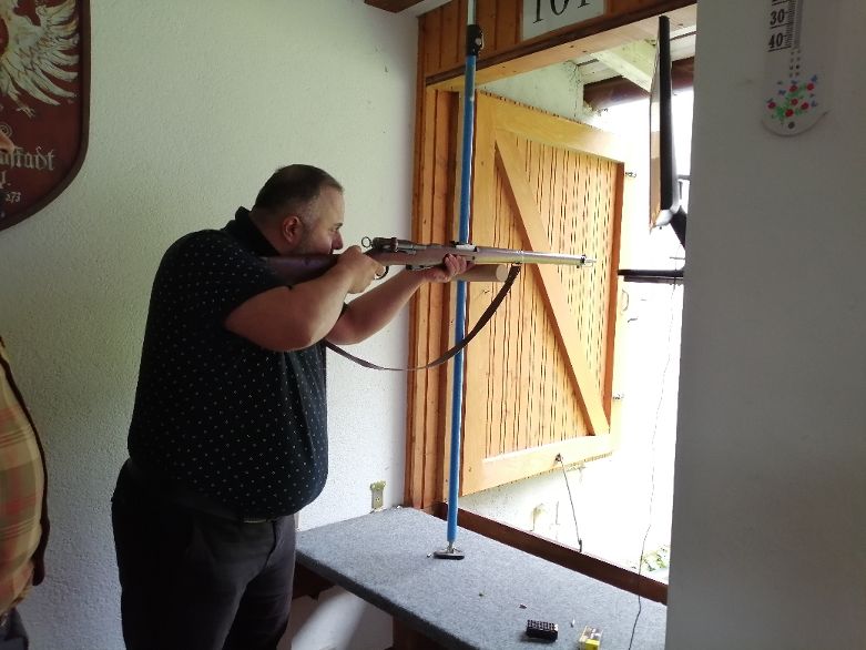 Ebenso durfte jeder Schütze mit einem alten Schweizer Gewehr aus dem Jahre 1910, welches unserem Oberschützenmeister Peter Sackner gehört, einen Schuss auf unserer KK100m Anlage mit unseren neuen Kugelfängen auf die Ehrenscheibe abfeuern. Wirklich nicht leicht mit diesem Oldtimer über Kimme und Korn die Mitte der Zielscheibe zu finden.