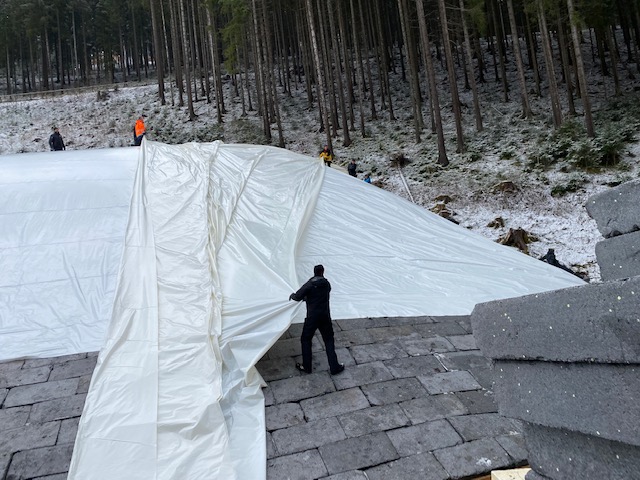 Gegen Mittag war es dann geschafft und der weiße "Gletscher" war unter einer weißen Folie verschwunden, welche das kostbare Material für den kommenden Winter hoffentlich gut schützt.